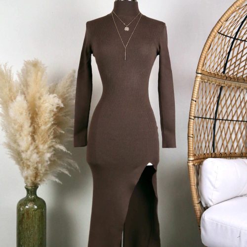 Long Sleeve Ribbed Bodycon Midi Dress With Side Slit in Brown