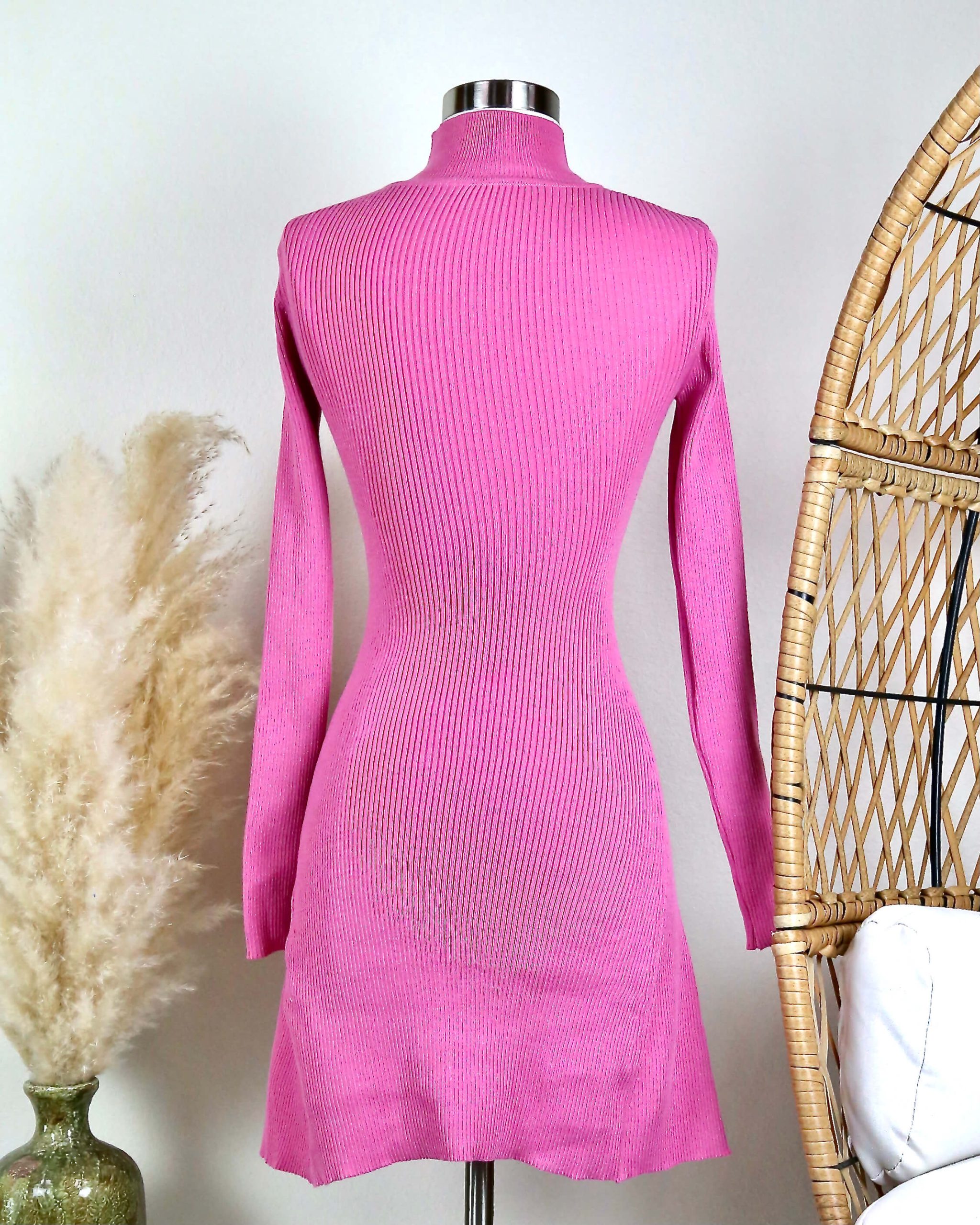 This gorgeous magenta toned dress features a mock neck, long sleeves, and a subtle side slit to further feminize this cute dress.