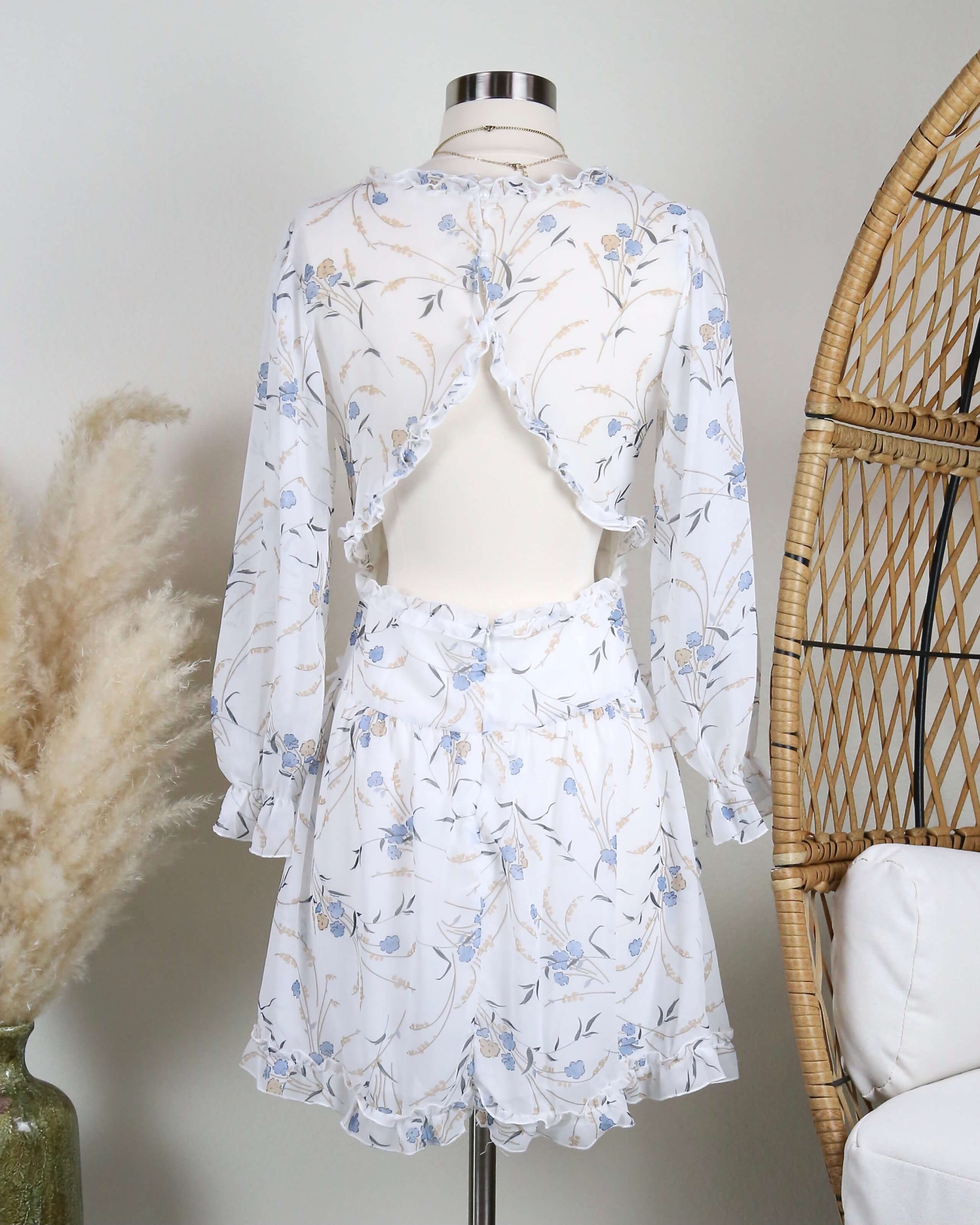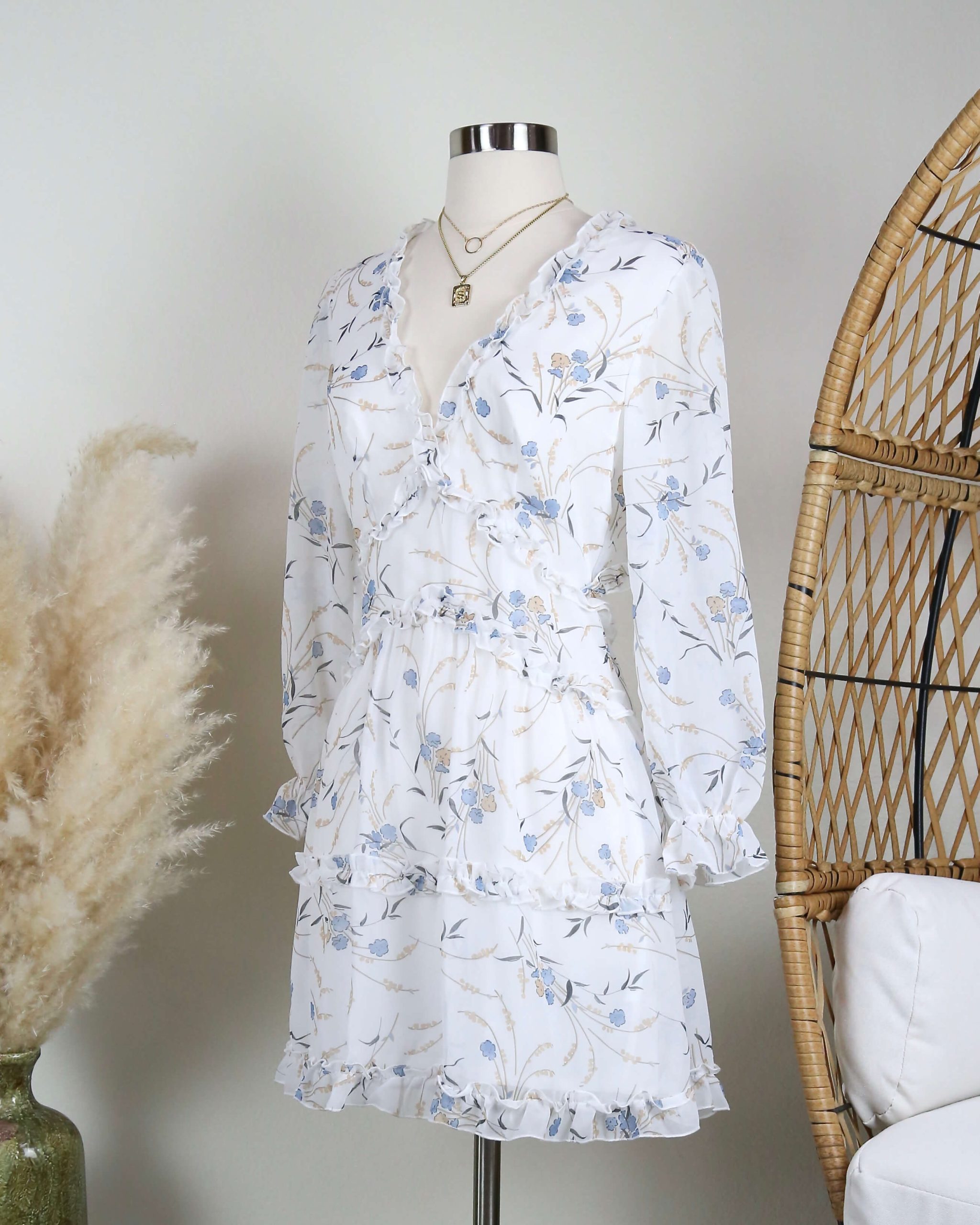This gorgeous dress features a V-Neck, ruffle trimmings, and an open back.