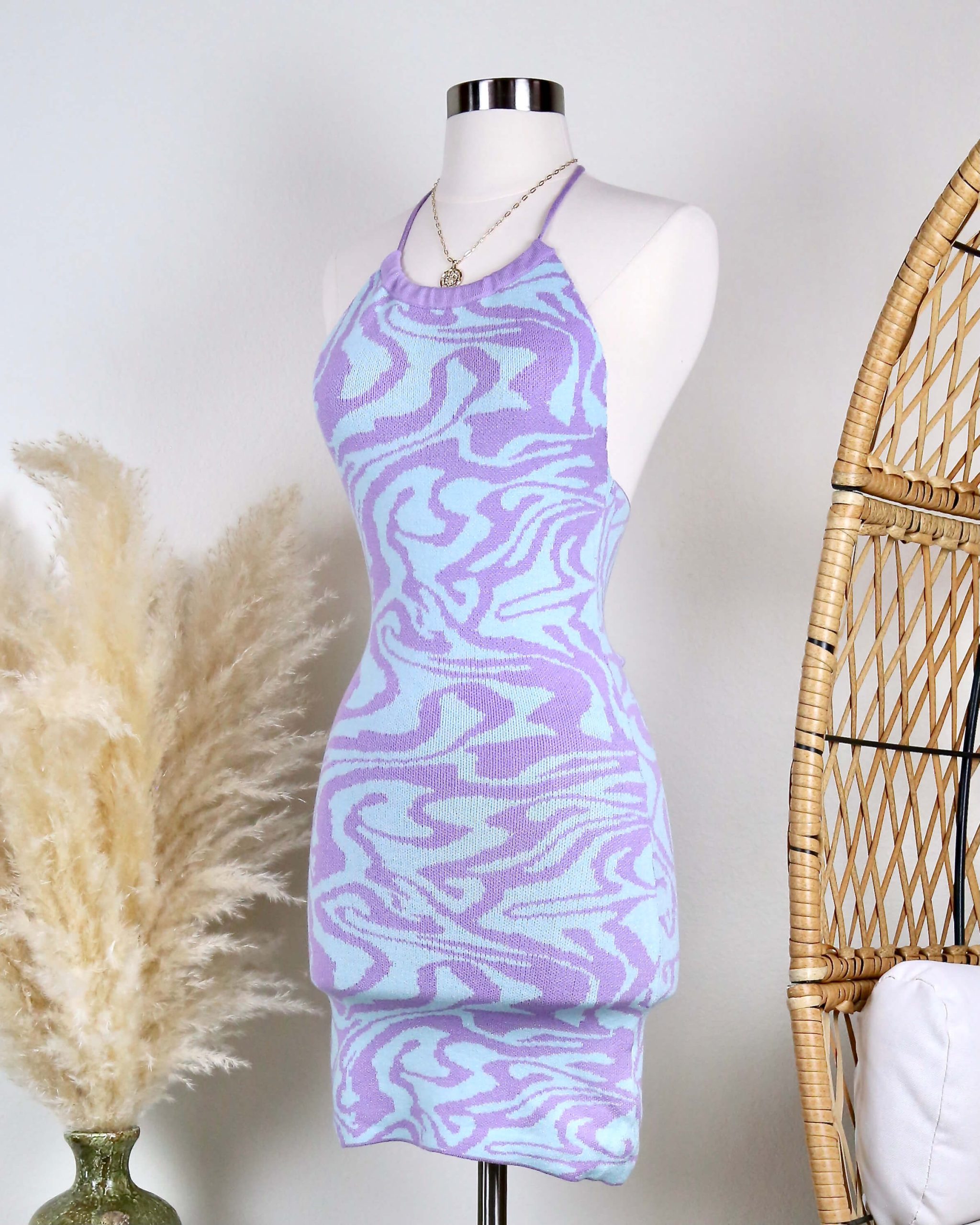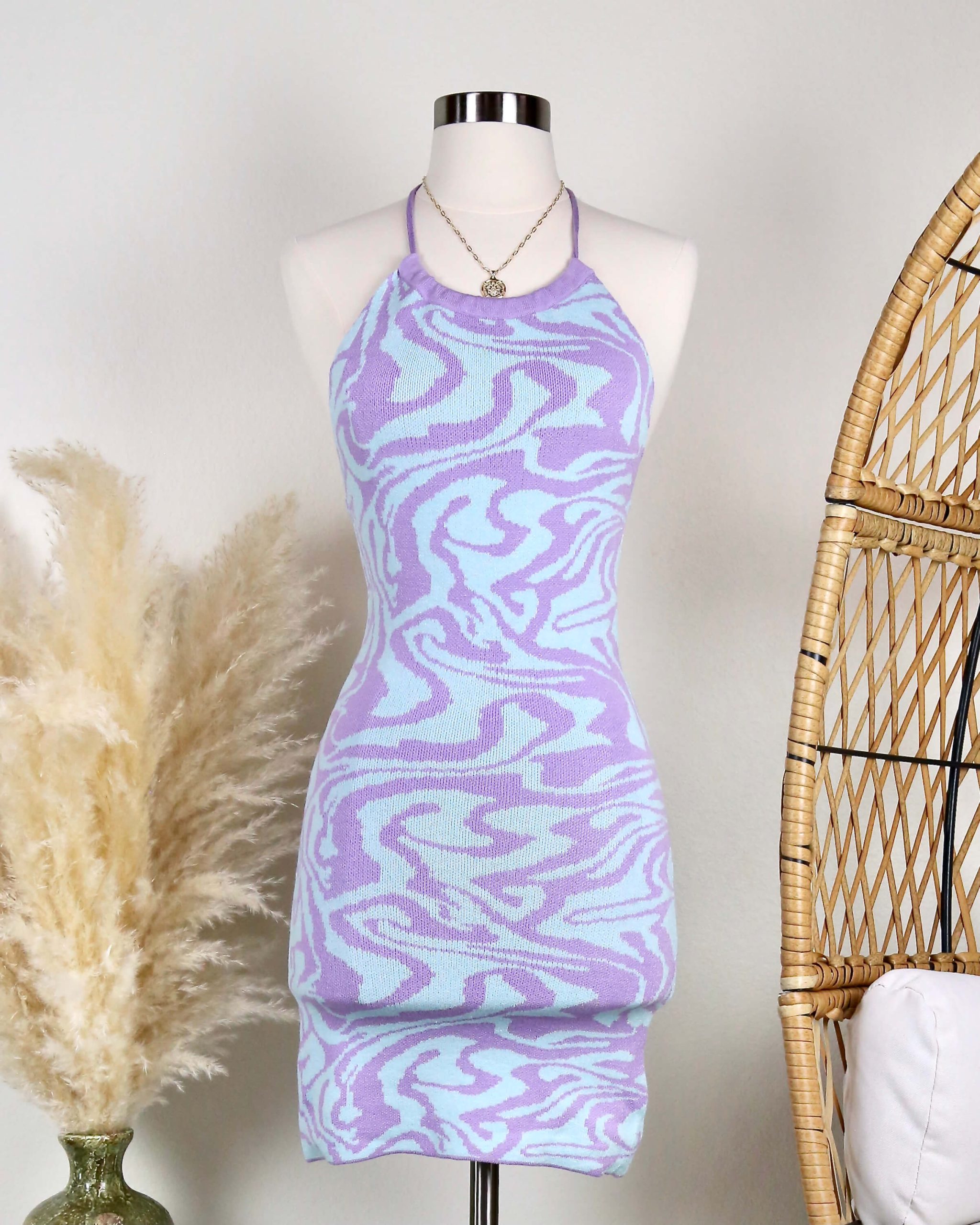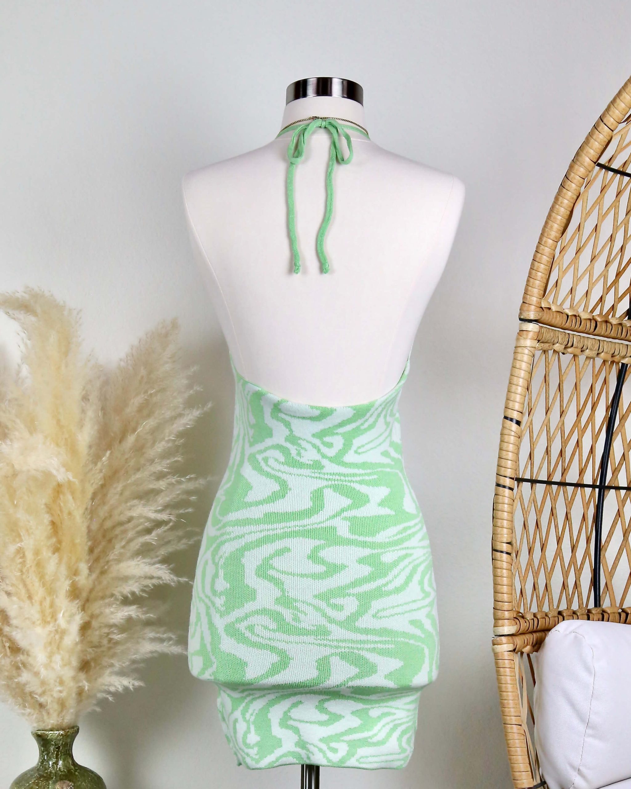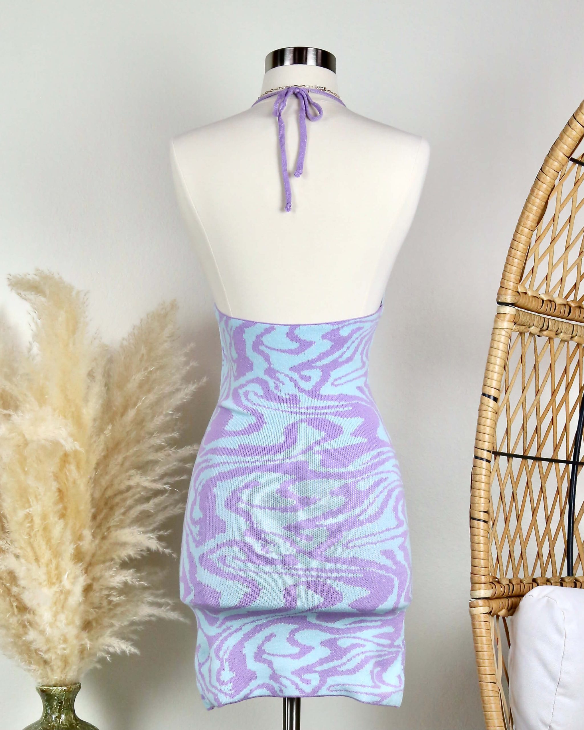 Beautiful mini dress featuring a swirl knit design, adjustable halter neckline, and an open back.
