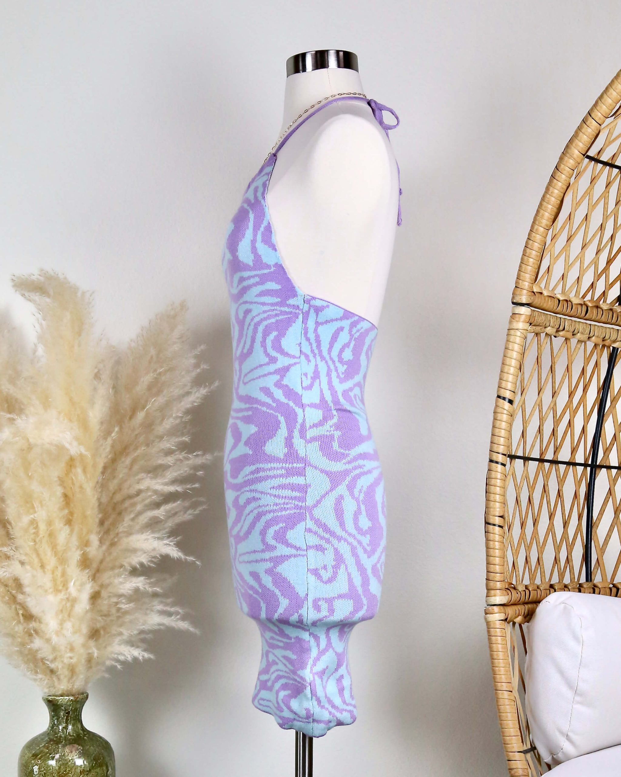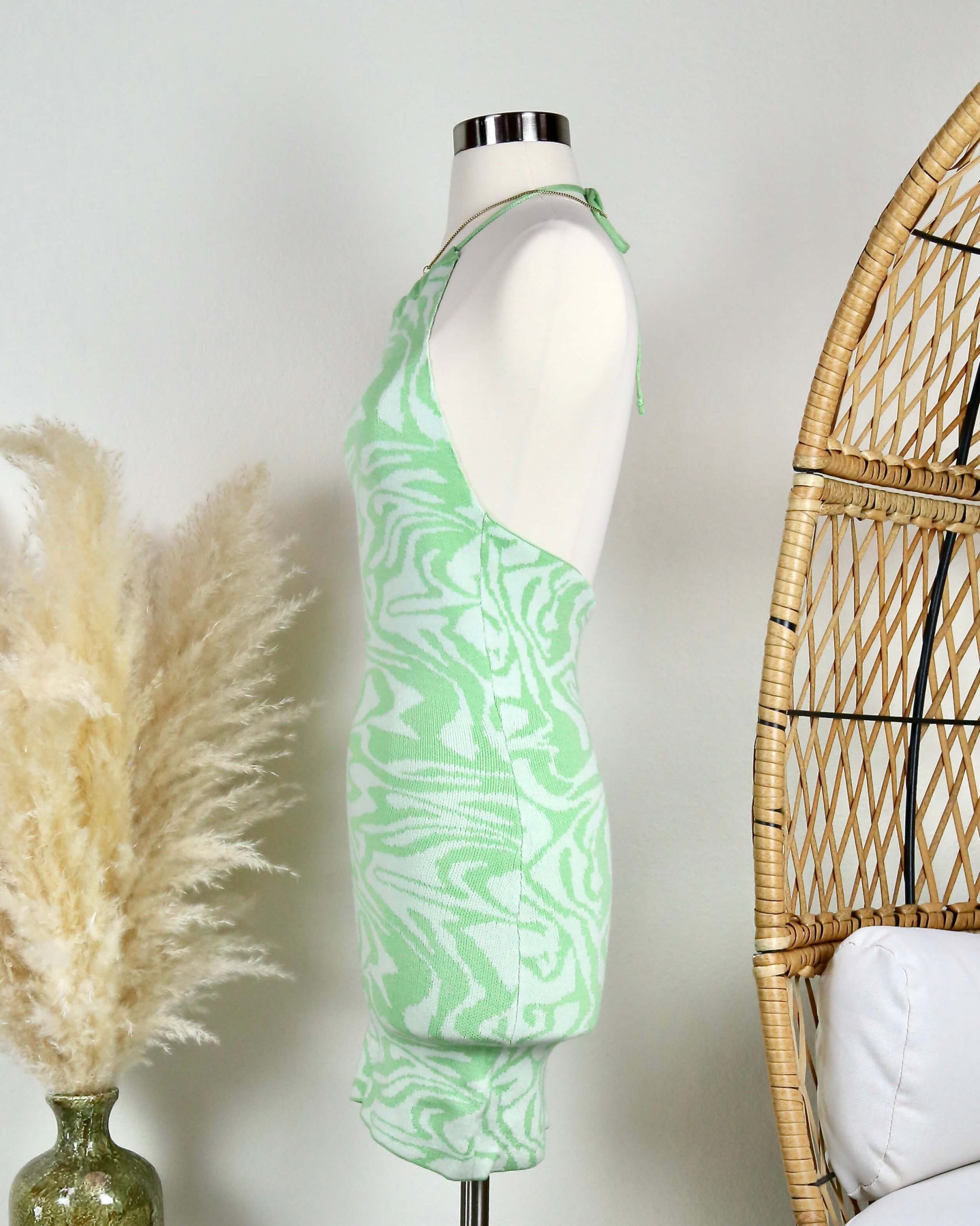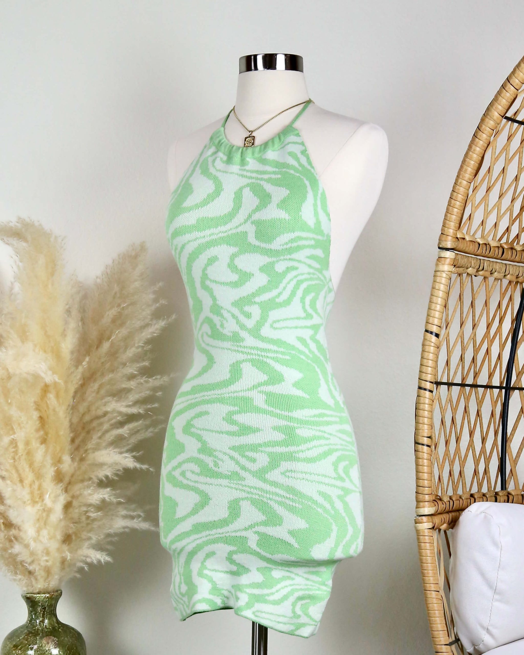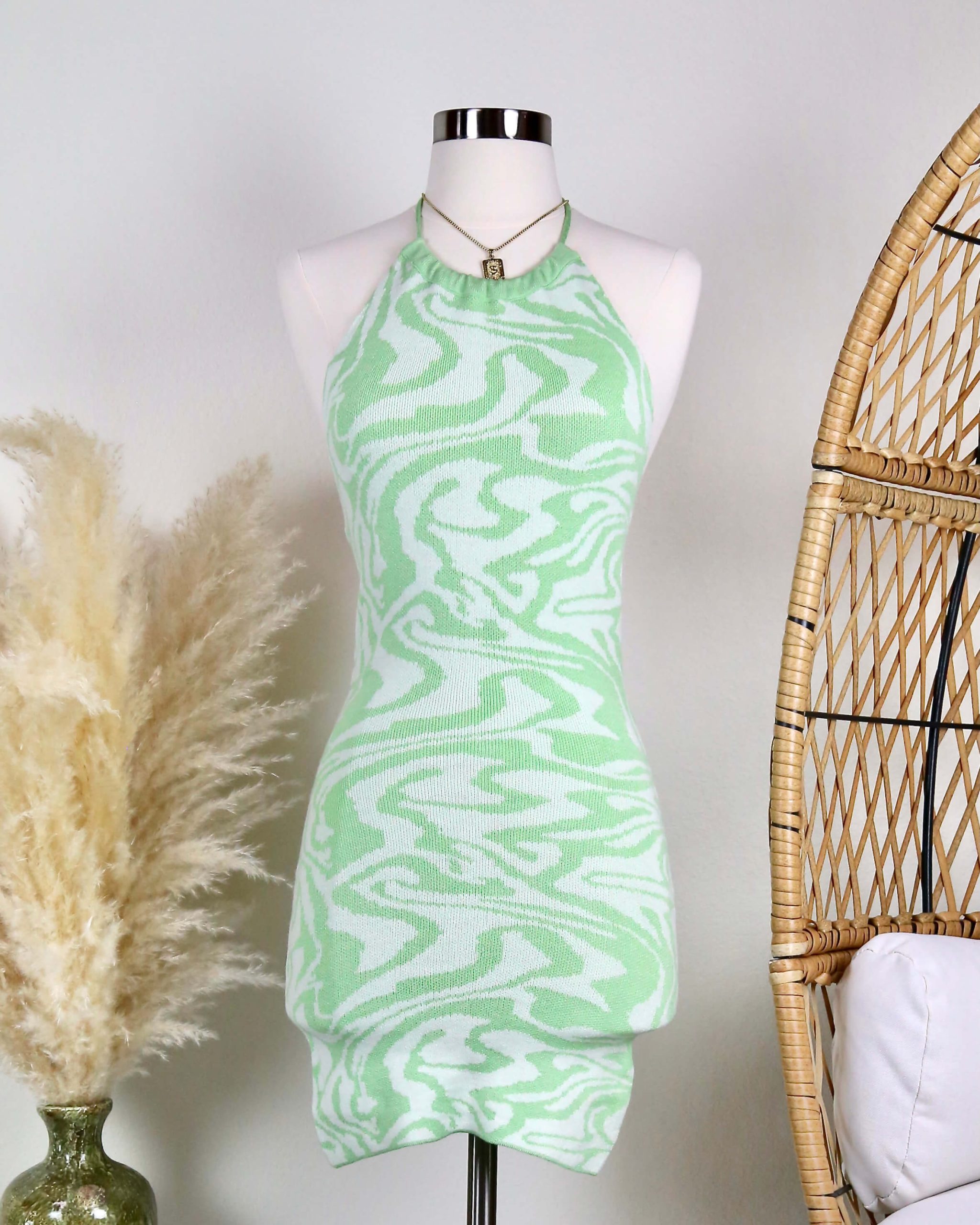 Beautiful mini dress featuring a swirl knit design, adjustable halter neckline, and an open back.